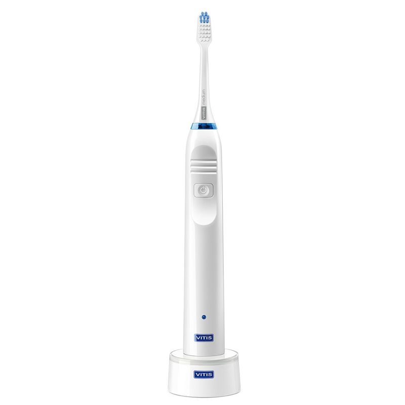 El cepillo eléctrico Vitis Sonic, con tecnología sónica, emite vibraciones acústicas a alta frecuencia que provocan la vibración en sentido lateral de los filamentos a una velocidad de hasta 40.000 movimientos por minuto. Los filamentos vibran a alta frecuencia (vibración sónica) sobre la superficie del diente, consiguiendo una eliminación eficaz del biofilm bucal (placa bacteriana). La elevada velocidad a la que vibran los filamentos emite ondas acústicas que se propagan a través de la saliva por toda la cavidad bucal, logrando una mayor desorganización del biofilm bucal. Además, se generan pequeñas burbujas de oxígeno en la saliva que se expulsan, pudiendo alterar la placa bacteriana en zonas de difícil acceso. La tecnología sónica con doble acción de los cepillos eléctricos Vitis Sonic, junto con el diseño exclusivo de sus cabezales, asegura una máxima eficacia en la eliminación del biofilm bucal, respetando dientes y encías. Mejora la higiene interproximal gracias a su tecnología sónica y al diseño exclusivo de sus cabezales, garantizando un cepillado eficaz y respetuoso con todos los tejidos bucales gracias a sus filamentos de Tynex de alta calidad.